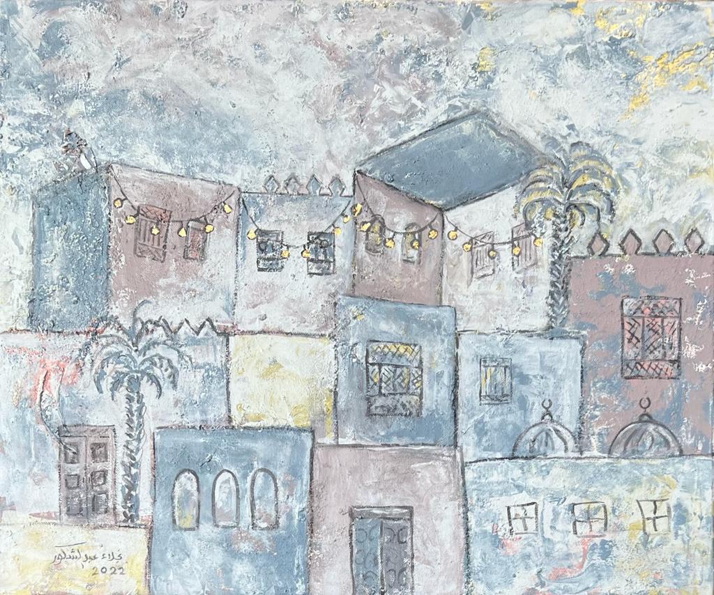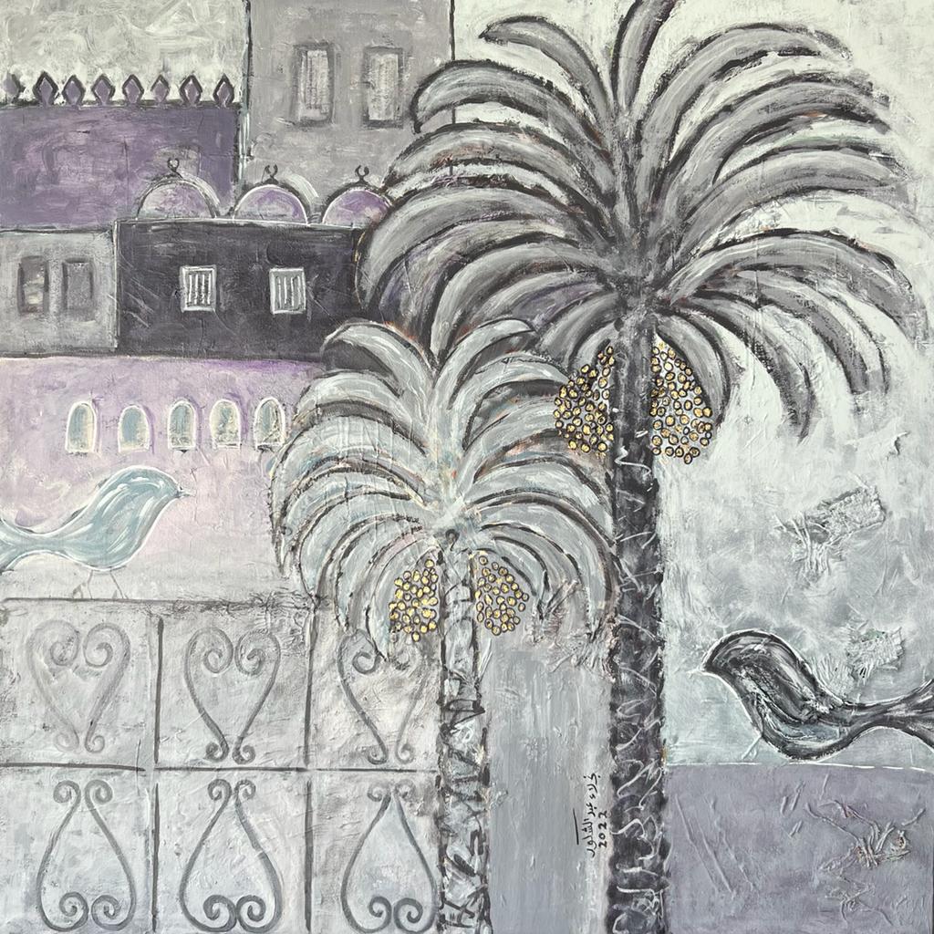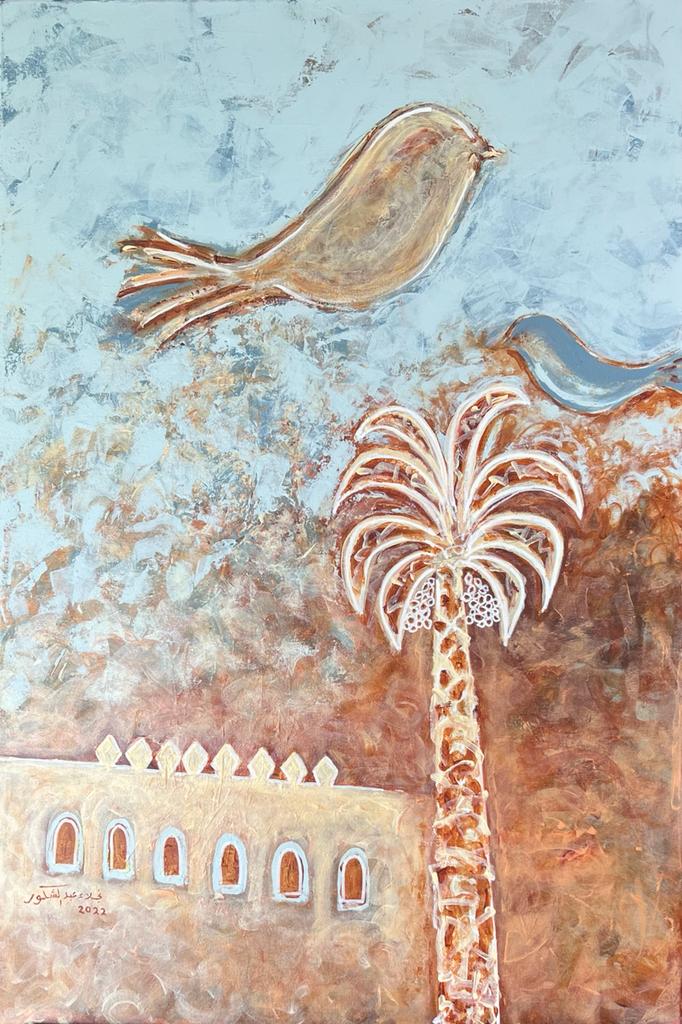 وترى الفنانة نجلاء عبدالشكور، أن لكل مئذنة صوت، ولكل جدار حكاية مدفونة في حنايا الروح، ومحفورة في الذاكرة.. وهي تتخذ من النخلة الشاهقة كرمز للخير والعطاء ولشموخ الوطن، وترى في التراث وعمارته ومعالمه شاهدا على تلك الأرواح التي ذهبت ولم تذهب ذكراها.. وكأن ريشتها هي لسان ناطق بما نحمله داخلنا من ذكريات ذلك الزمن الجميل، وما نحمله له من امتنان.