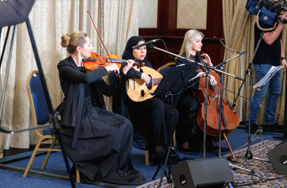 وشهدت الندوة الثقافية أيضاً تقديم مقطوعات موسيقية، مزجت فيها العازفات الموسيقى العربية مع الموسيقى الروسية، والتي نالت استحسان وإعجاب الحضور.