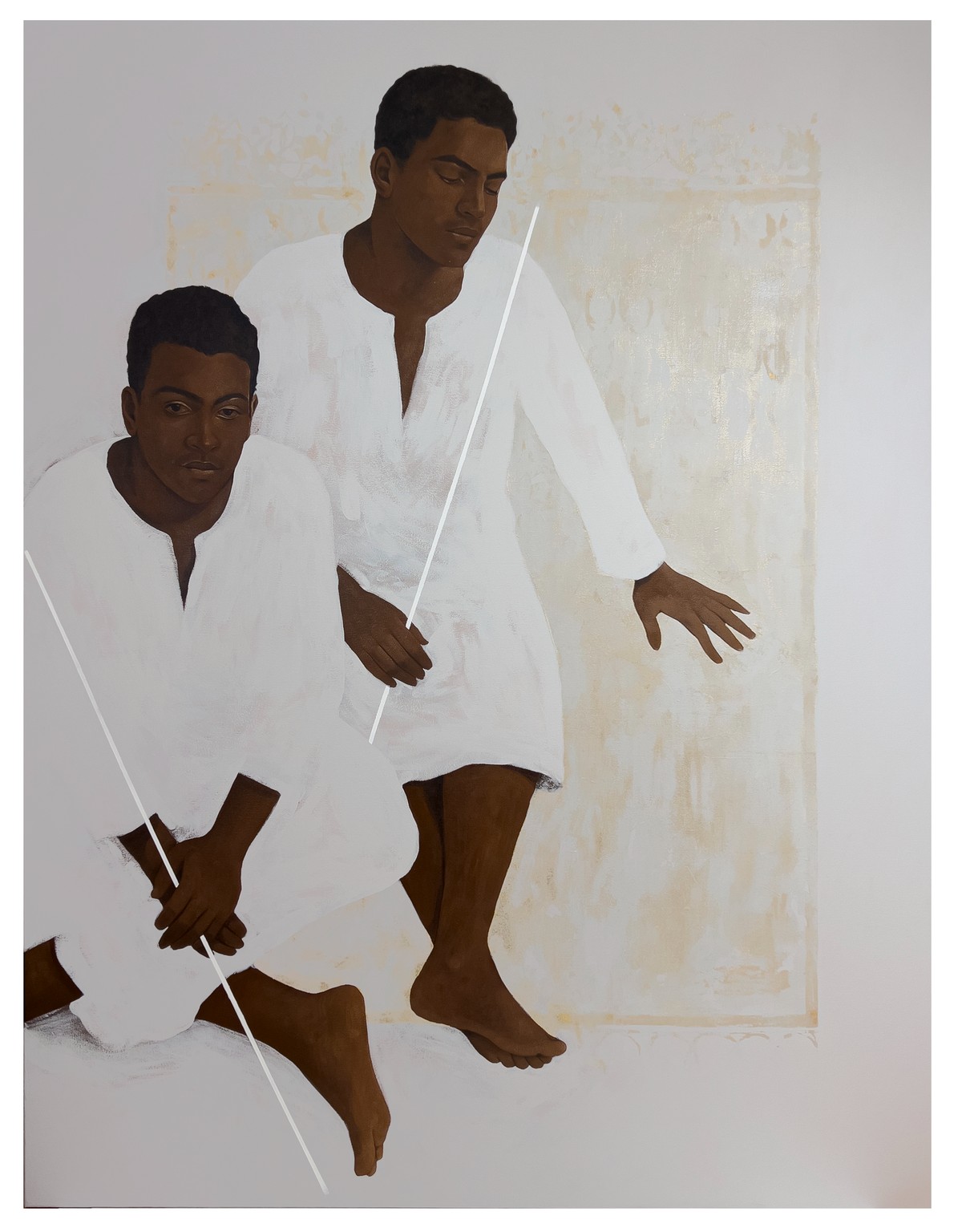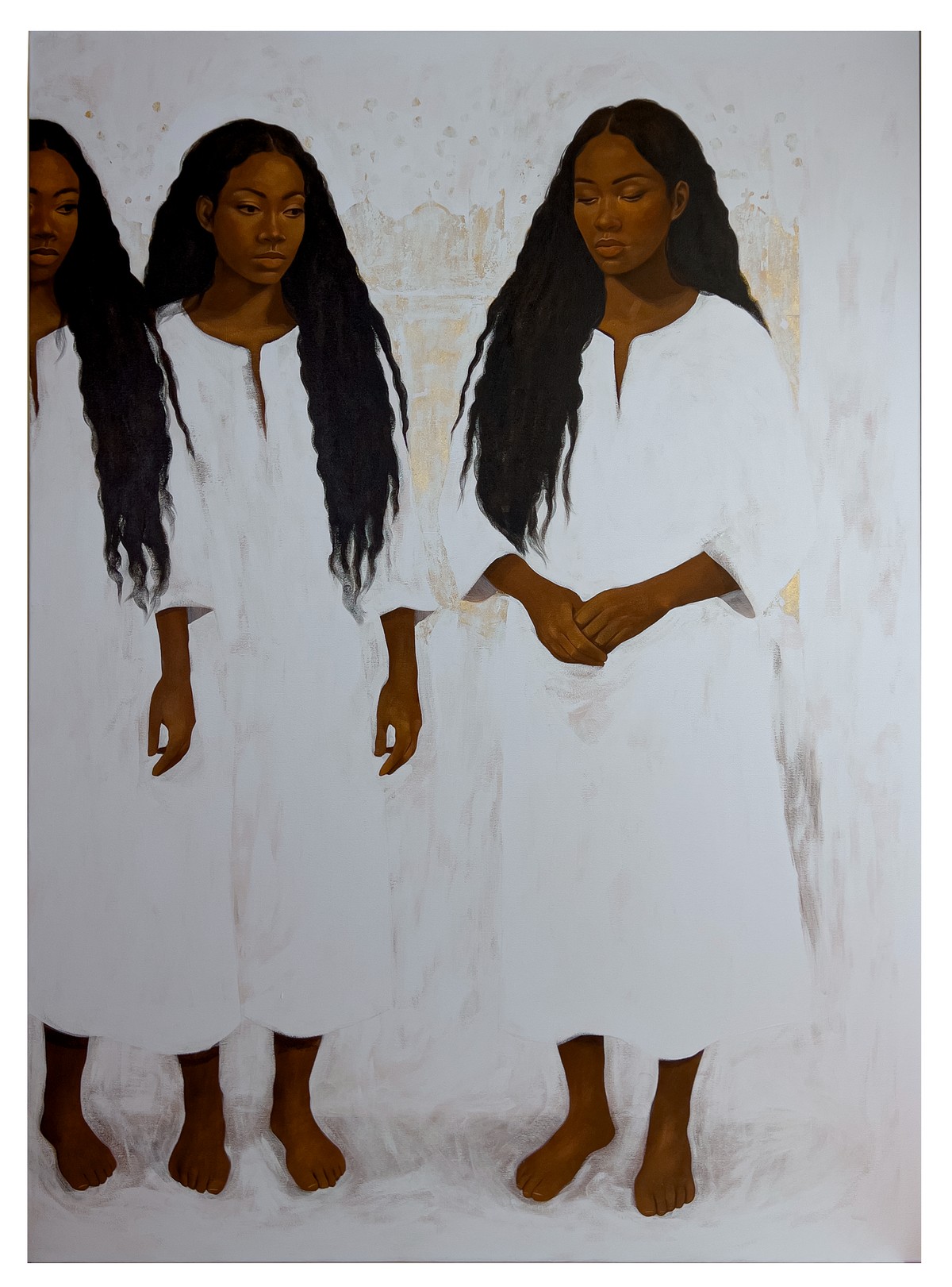 في أعمال "مقام النور"، لا يظهر الجسد الإنساني كمجرد عنصر بصري، بل ككائن متوهّج بالصمت، غارق في حالة من التأمل العميق. تتجسد الأجساد منكفئة على ذواتها، مثقلة بثقل الزمن، لكنها محاطة بهالات ذهبية، كأن الضوء ينبثق من داخلها لا من خارجها. وتتخلل اللوحات خطوط بيضاء تقطع الصمت، وتفتح الجسد على مقام آخر يتجاوز الشكل واللون، ليلامس جوهر المعنى. كل ملمس هنا يتحول إلى قصيدة، كل وجه إلى مرآة، وكل فراغ إلى نافذة مفتوحة على عوالم ميتافيزيقية.