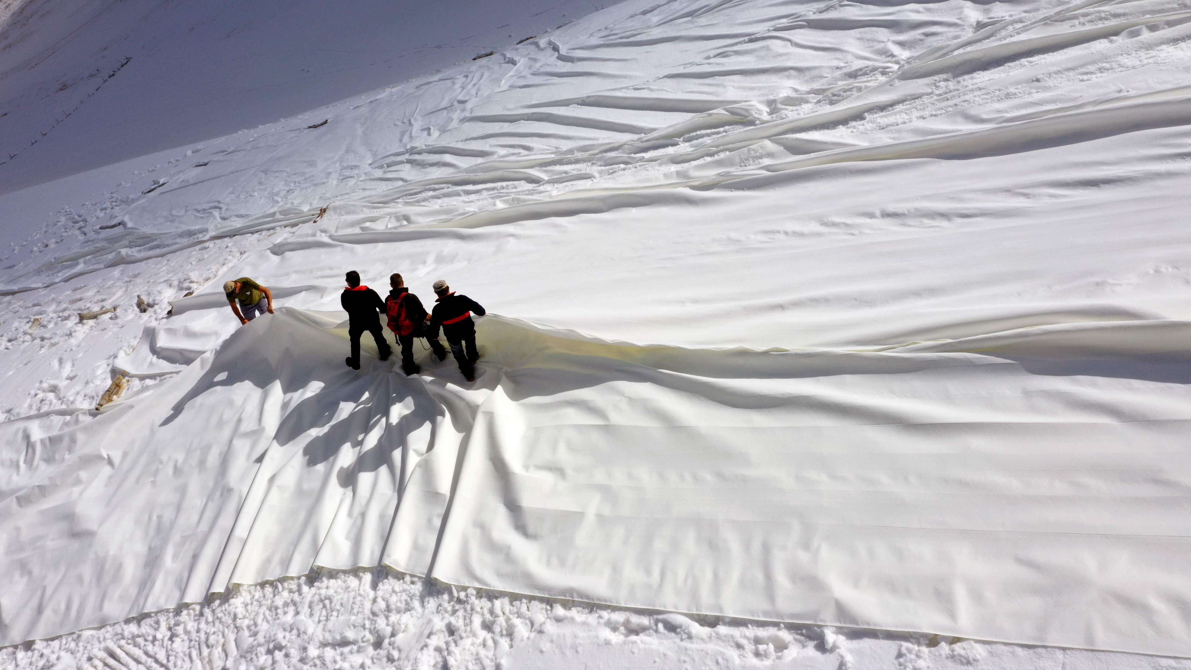 ويبلغ طول كل شريط قماشي 70 مترا وعرضه خمسة امتار وتبلغ كلفة صنعه 400 يورو. ولا يمكن التفريق بين لونه الأبيض ولون الثلج الذي بدأ يذوب بفعل ارتفاع الحرارة.