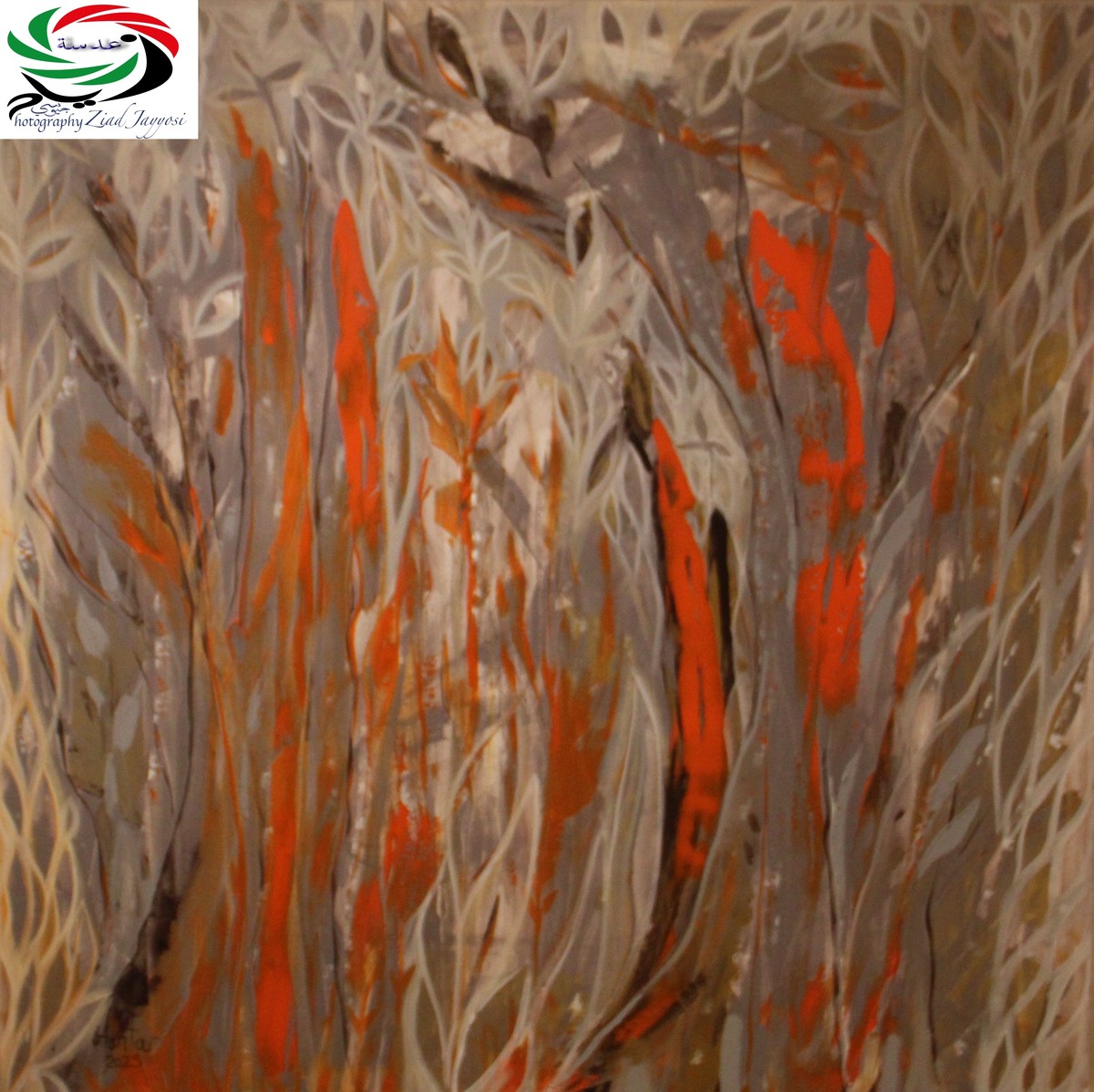 أما لوحة ثانية، فقد اعتمدت أسلوب التجريد العضوي(Organic Abstraction) ، حيث تتشابك الأغصان والألوان بإيحاءات نارية توحي بصراع بين الحياة والموت. الألوان الرمادية واللون الرملي والمتعارف عليه باللون "البيج" وهي كلمة فرنسية، وتوشيحات الأحمر والبرتقالي والأسود والأبيض، وتوشيحات الأحمر والبرتقالي والأسود، مع تكوينات طولية وحلزونية، أعطت انطباعًا بجدلية النور والعتمة، والحياة والفناء. بالاعتماد على الرمزية في عناصر من الطبيعة، مستفيدة من المساحات اللونية التي تضم الأغصان والنباتات، تاركة للمتأمل أن يتخيل ويؤول رموز اللوحة، من خلال التشابك بين الخطوط والألوان، وخاصة مع غلبة اللون الرمادي على خلفية اللوحة وتكوين الخطوط الطولية ككل اللوحات، إضافة للتموجات اللونية في الخطوط المنحنية. وهذا التكوين الحركي المتصاعد للأعلى واللوني للوحة جعلها قريبة للزخرفة، ومن خلال اللون الأحمر القاني والبرتقالي في مقدمة اللوحة، وهي ألوان حارة مقابل خلفية اللوحة باللون الرمادي، يشعر المتأمل أن هناك صراعا بين النور والعتمة والموت والحياة.