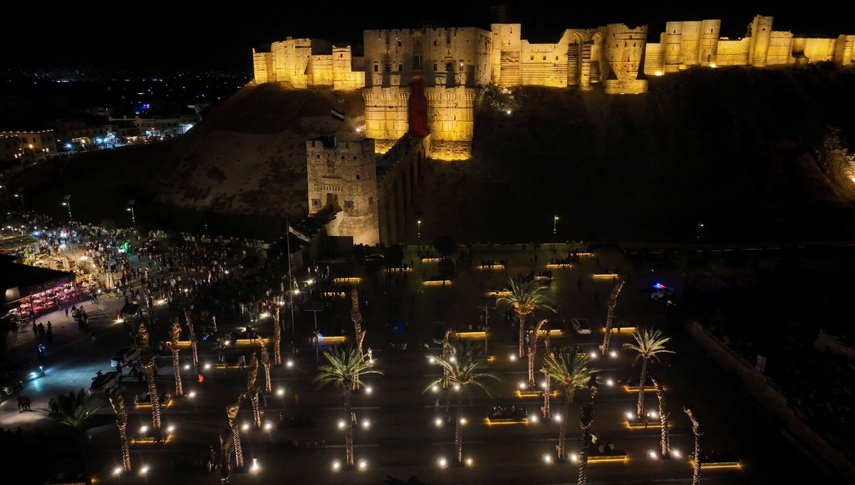 وقد التقطت طائرة مسيّرة مشاهد بانورامية للقلعة العريقة، التي تتربع على تل مرتفع في قلب مدينة حلب، بينما احتشد عدد من المواطنين للاحتفال بهذه المناسبة الثقافية والوطنية.