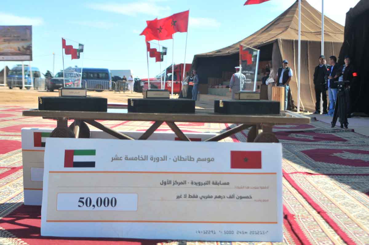 وأسفرت نتائج المسابقة عن فوز الفريق الذي يقوده لحسين بوحمو من كلميم بالمركز الأول، ونال المركز الثاني الفريق الذي يقوده خليفة مساني من شيشاوة، وحل بالمركز الثالث ياسين بوتغروت من لعيون، حيث قدمت الدروع والجوائز النقدية للفائزين والمشاركين، وقدم وفد دولة الإمارات هدايا تذكارية من التراث الإماراتي للجنة المنظمة لموسم طانطان.