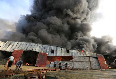 They told Reuters that, as of 1100 GMT, fire trucks had not been able to put out the blaze in the warehousing area, which they said appeared to have been caused by an electrical short circuit.