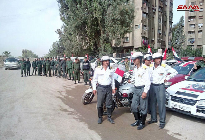 ونقلت وكالة الأنباء السورية الرسمية "سانا" أن عناصر الشرطة رفعوا العلم الوطني في منطقة اليرموك "بعد تحريرها من الإرهاب".