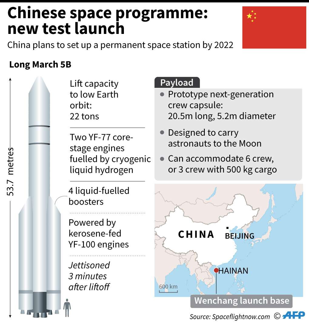 وكانت أطلقت الثلاثاء بواسطة صاروخ "لونغ مارتش 5بي" وهو الأقوى الذي تستخدمه الصين وسيسمح بنقل اجزاء محطة الفضاء التي سميت "تيانغونغ" (القصر السماوي).