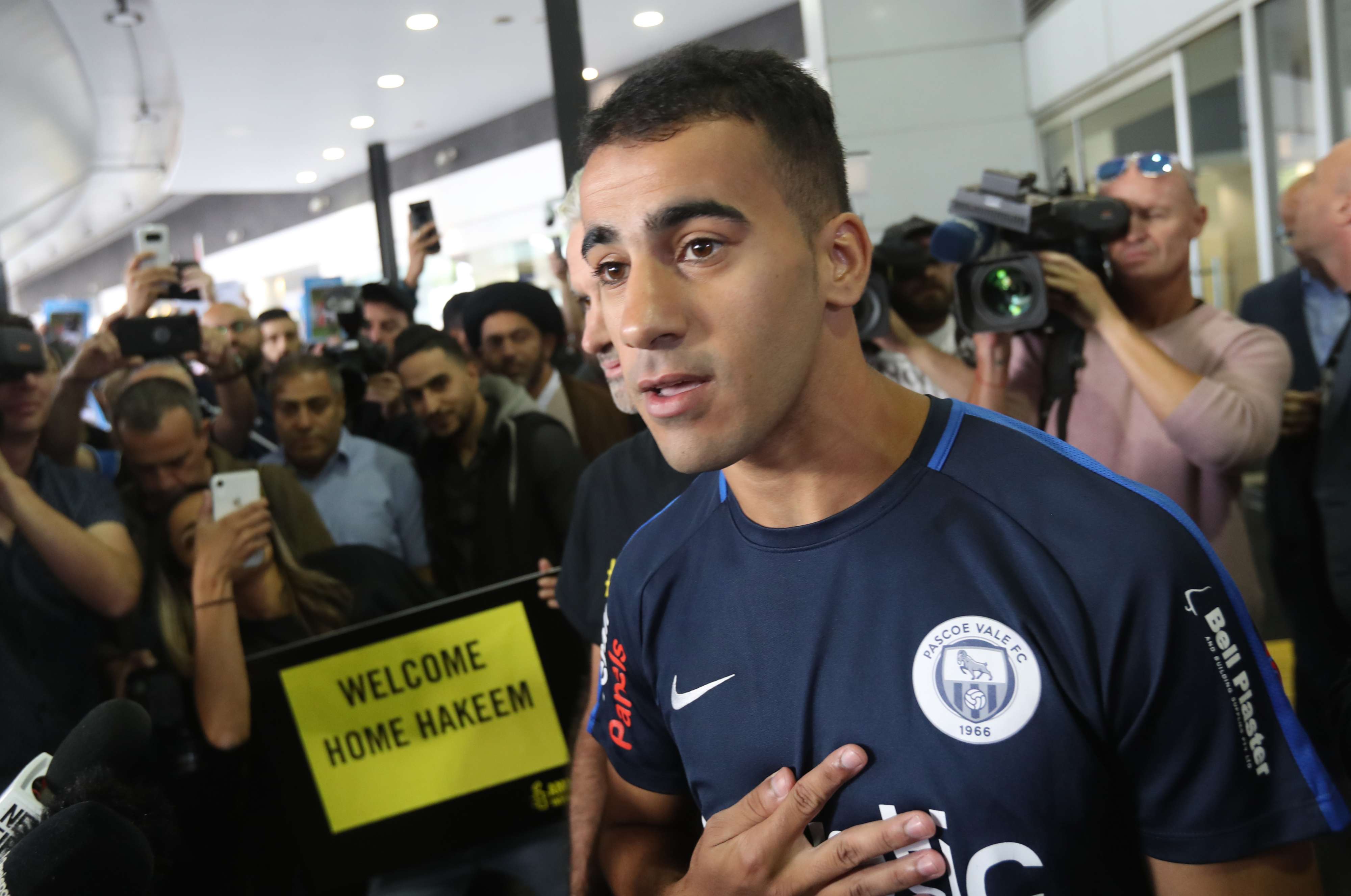 وقال العريبي مبتسما اثناء نزوله من الطائرة في ملبورن "أشكر أستراليا... لا أملك الجنسية بعد، لكن أستراليا بلدي. أريد أن أموت في أستراليا". وانتظر عدد من مؤيدي اللاعب في المطار وهم يرتدون قمصانا كتب عليها #انقذوا حكيم.