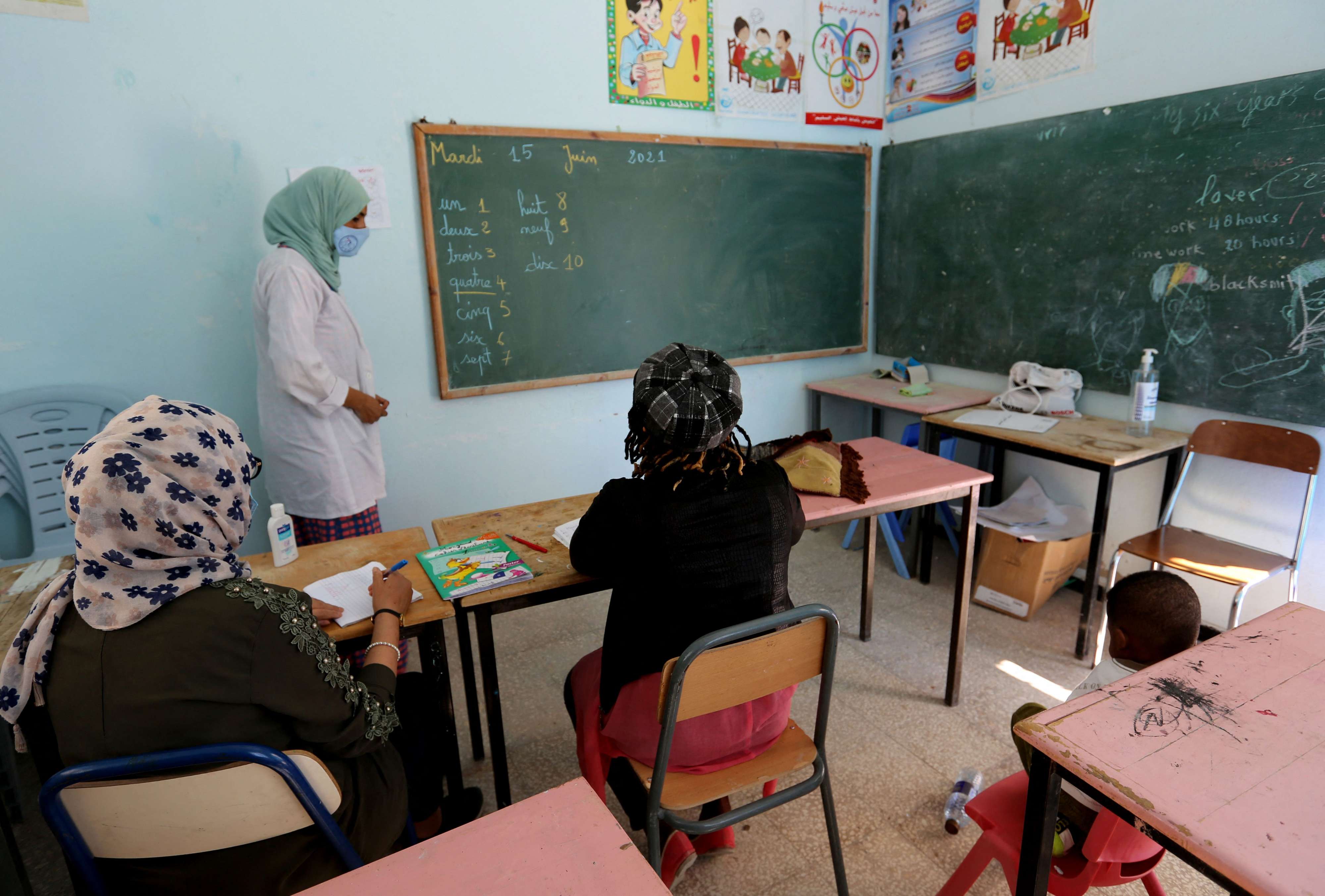 مدنين (تونس) - في مقدّمة أحد الصفوف الصغيرة، تجلس ثلاث نساء من جنسيات مختلفة على مقاعدهن الدراسية لتعلّم اللغة الفرنسية رغم الحر الشديد، في إطار جهود تقوم بها العديد من الجمعيات في مدنين بجنوب تونس لدمج المهاجرين.