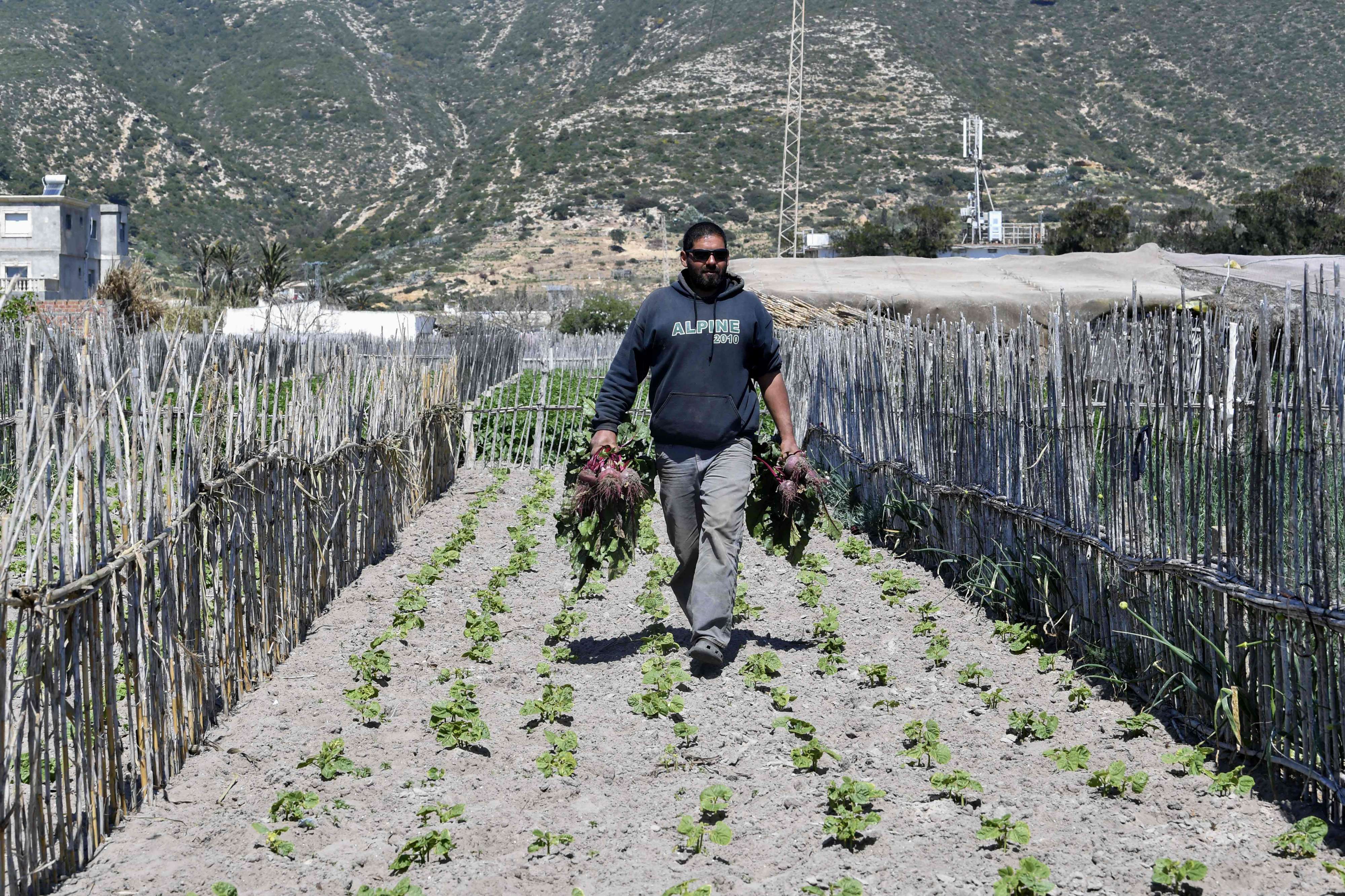 غار الملح (تونس) - يقوم علي بجولته الصباحية بين قطع الأرض المستطيلة المسيجة بالقصب على الرمال عند أحد سواحل شمال تونس، متفقدا مزروعاته من البطاطس والخس والبصل التي يعتمد فيها نظاما زراعيا فريدا في العالم يعتمد على حركة المد والجزر للريّ وتعويض الشحّ في المياه.