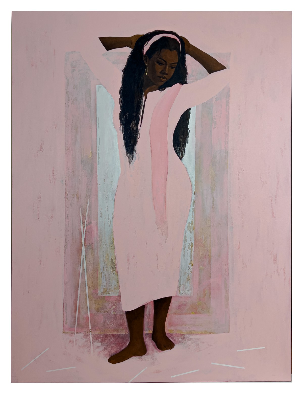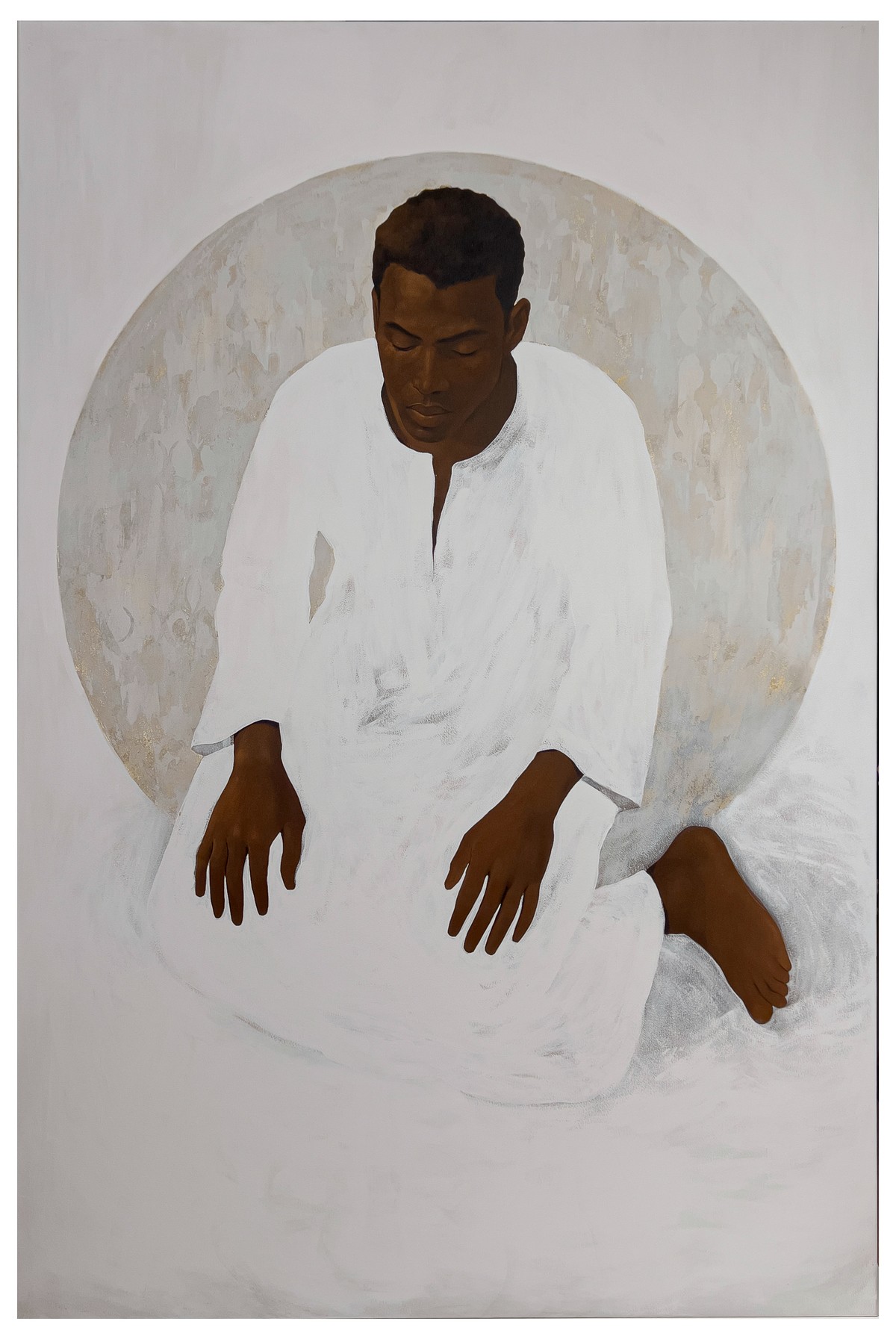 في أعمال "مقام النور"، لا يظهر الجسد الإنساني كمجرد عنصر بصري، بل ككائن متوهّج بالصمت، غارق في حالة من التأمل العميق. تتجسد الأجساد منكفئة على ذواتها، مثقلة بثقل الزمن، لكنها محاطة بهالات ذهبية، كأن الضوء ينبثق من داخلها لا من خارجها. وتتخلل اللوحات خطوط بيضاء تقطع الصمت، وتفتح الجسد على مقام آخر يتجاوز الشكل واللون، ليلامس جوهر المعنى. كل ملمس هنا يتحول إلى قصيدة، كل وجه إلى مرآة، وكل فراغ إلى نافذة مفتوحة على عوالم ميتافيزيقية.