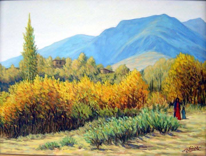 سليمان شاكر من مواليد 1935، ناحية گوير التابعة لقضاء مخمور بمحافظة أربيل، كان شغوفاً بالفن وعاشقاً له منذ طفولته وفي يفاعته، وكان أول من التحق بجامعة بغداد من كوردستان، وكان ذلك في عام 1952، وتخرج منها، من كلية الفنون الجميلة، وقام بتدريس الفن التشكيلي في مدارس ومعاهد الفنون الجميلة لمدة تتجاوز خمسة وثلاثين عاماً. وهو صاحب أشهر لوحة للراحل مصطفى البارزاني، والمعروضة في قاعة الاستقبال في برلمان كردستان العراق. وفي عام 2007 جمع أعماله الفنية التي امتدت على مدى ستين عاماً في معرض فني بجوار منزله. أعماله تحاكي حياة الكورد وكردستان، تحاكي عاداتهم وحياتهم وجبالهم وطبيعتها. وهناك شيء من التوأمة بين الكورد وطبيعة كردستان، فكما الكورد يتمتعون بروح جميلة وطيبة ونقية، كذلك طبيعة كردستان التي تعتبر بحق من جنان الأرض. فكيف لا يبدع الفنان الكردي وهو يتنفس هذا الجمال، ويملأ روحه وعينه بكل هذا النقاء، وينهل من ينابيعها دهراً من الزمن. قد قلتها سابقاً وأقولها الآن: لا يمكن أن تجد فناناً كردياً لم تلهمه طبيعة كردستان وجمالها، بل هي السمة المشتركة بينهم جميعاً، كل بطريقته وأسلوبه. وسليمان شاكر على امتداد سبعة عقود تزيد أو تنقص قليلاً وهو يشتغل بقدراته الخاصة على خيارات عديدة متاحة برؤاها وبما تحمله في دواخلها من عناصر شتى في الأزمنة الثلاثة: الماضي بإرثه الكبير، والحاضر المعاش، وما يتم خلقه، والقادم أو المستقبل المتخيل، الحلم الجديد المتجدد. فتتملكه رغبة لا تقاوم في الإمعان والتأمل في مفردات الأزمنة الثلاثة، وفي إضاءة جوانب كل منها. فسليمان شاكر يعيد النظر فيها جميعاً وعلى نحو دائم، بحثاً عن الأجمل والأبقى، بأدواته وتقنياته، لا استجابة للغة عصره وحاجاته، بل بما يجده في ذلك الإبداع المفتوح على أحدث التقنيات والأساليب، وصهر كل خبراته بلغة إبداعية دائمة الحراك، مفتوحة على الحياة طولاً وعرضاً وسطحاً وعمقاً. فعينه كانت مفتوحة على كل التجارب وقيمها الجمالية، وكأنها كانت المدى في اتساعه للالتقاط بأمانة وعمق ونزاهة إبداعية وإنسانية، في مكان أكثر غنى من بقاع الأرض كلها. فهو يوظف الماضي لبلورته ومنحه مزيداً من العمق، وهذا ما يمنح الحاضر قوة تترك آثارها على تجربته برمتها. يأخذ الماضي دون أن يسمح له بالهيمنة والتسلط، وهذا مطلب كل مبدع. وهذا يقودنا إلى البحث عن تلك القيم الإبداعية الرفيعة التي حققها شاكر، وهذا بدوره يحملنا إلى موقع آخر من المسألة، كملاحقة التأثيرات المتبادلة بينه وبين الأزمنة بخصائصها الاصطلاحية التي تجعل منها موضوعاً فنياً غنياً، جديراً بالدراسات الجمالية، شأنه شأن كل الحالات الإبداعية التي يمكن الوصول إليها، والمنفتحة على التأثيرات والاستلهامات التي تلعب الدور الأكبر والأهم في الوصول إلى نتائج إبداعية لم يكن الوصول إليها متاحاً مهما غاص الفنان في التفاصيل.
