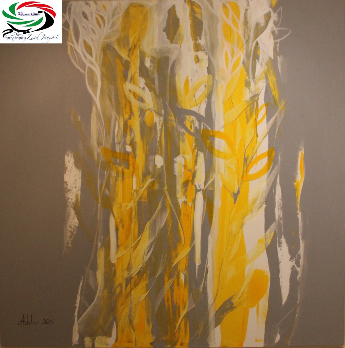وفي لوحة ثانية شدتني، كانت الخلفية رمادية هادئة، يتوسطها شخصان متقابلان كأنهما رجل وامرأة، يبدوان كعمود من الضوء يتبادلان الهمسات. اللوحة اعتمدت على لونين أساسيين إضافة إلى الرمادي: الأبيض الكريمي، والأصفر الداكن المائل إلى البرتقالي. النباتات تمتد بخطوط عمودية متداخلة كخيوط ضوء تلتف حول الأشخاص، وكأنها شلالات نور. فالتكوين (Composition) القائم على انثيال الخطوط العمودية أعطى انطباعًا بامتزاج همسات الحديقة مع همسات العشاق، فخلقت جمالًا آخر يفيض بالسكينة والحياد البصري. يتصاعد التدرج اللوني من الأسفل إلى الأعلى كأنه انفجار ضوئي، فيمنح اللوحة إحساسًا بالانسياب والحركة المستمرة.