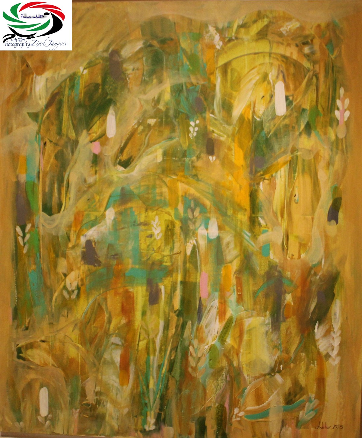 في هذه المجموعة حضرت النباتات وحدها من غير شخوص، إلا في لوحة واحدة ظهر فيها حصان بين النباتات، حتى أني شعرت أن اللوحات تسأل عن زوارها، فاللوحة الأولى، بألوانها الذهبية والضياء الصاعد وكأنه من القمح في موسم الحصاد، أظهرت خيولًا شامخة في الثلث الأعلى، وكأنها بديل رمزي للإنسان. فالعلاقة مع الطبيعة ليست حكرًا على البشر، بل تشمل جميع الكائنات. اللون الأخضر رمز الخصب، والأزرق والأبيض ألوان صفاء، فجاءت اللوحة إشارة واضحة لعطاء الطبيعة وتجدد الحياة. ومن خلال هذا التكوين اللوني الذي يرتبط بلون القمح في موعد الحصاد تحت الشمس، نجد الخيول في الثلث الأعلى من اللوحة، وقد تكون الخيول جواد وفرس، والأغلب فرس ومهرة من حيث التدقيق بالأحجام، فهنا استبدلت الفنانة الإنسان بالخيل، في إشارة رمزية أن دورة الحياة والعلاقة مع الطبيعة تشمل كل الأحياء، فالخيول عشبية الغذاء وهذا ما يربطها بالأرض والنباتات بقوة، مما يجعل من اللوحة إشارة واضحة لعطاء الطبيعة وجمالها، وقد تمازج اللوحة بألوان الأخضر رمز الخصب، وتوشيحات من الأزرق والأبيض وألوان فرحة أخرى، في إيقاع بصري من خلال التكوين اللوني، وضربات الفرشاة للألوان بتدفق جميل وانسيابية بدون انسيالات لونية أو بثور، فأصبحت لوحة قابلة للتأويل بأكثر من اتجاه من خلال الكتلة واللون، فكانت اللوحة أشبه بتدفق النور بين سنابل الحقول، في إشارة واضحة يراها المشاهد لتجدد الحياة وعدم خلودها للسكون، في علاقة واضحة بين اللون والضوء وما اختزنته تلافيف الذاكرة عبر حياتها من مشاهد بصرية.
