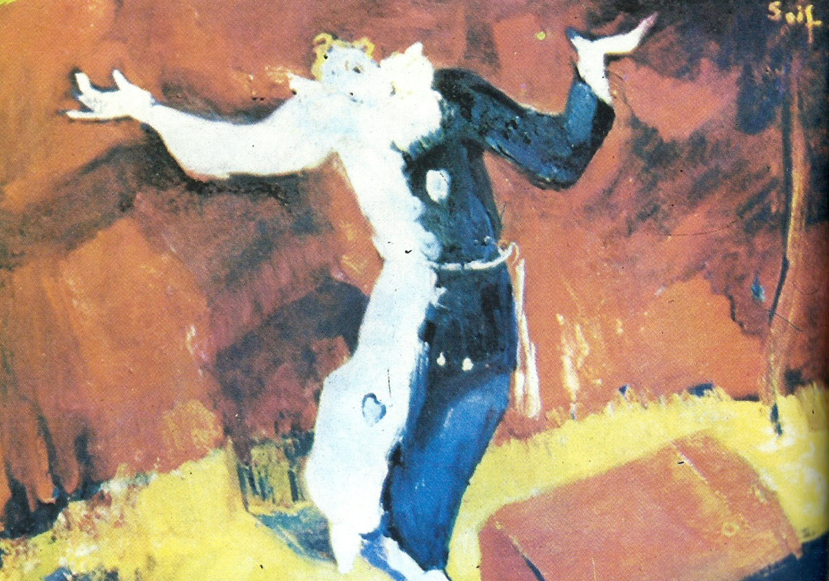 وإذا كان أبناء جيلي اهتموا بحوار الألوان، فإنني لاحظت أن وانلي وجيله اهتموا بالألوان غير الحوارية رغم وجود الدرامية أو الحكائية في الكثير من لوحاتهم، ومثال على ذلك لوحة سيف العبقرية "البلياتشو" التي رسمها عام 1948 (ألوان زيتية على ورق) ففيها نرى ذلك البلياتشو يريد أن يبوح لنا بأسراره وحركة يديه وطول ذراعيه يدلان على فداحة الموقف، ولعل غياب أغلب التفاصيل الجزئية في كتلة الجسد ووجه البلياتشو المغطى بالمساحيق البيضاء قد أسهمت في عدم وجود ألوان حوارية في مسطح اللوحة.